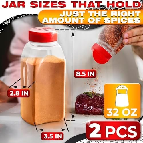 2Pcs Seasoning Containers with Dual Shake Lids – 32oz Kitchen Storage Jars for Herbs, Spices and Dry Goods, Transparent Design with Wide Mouth for Easy Filling, Durable Odor-Resistant Plastic Material