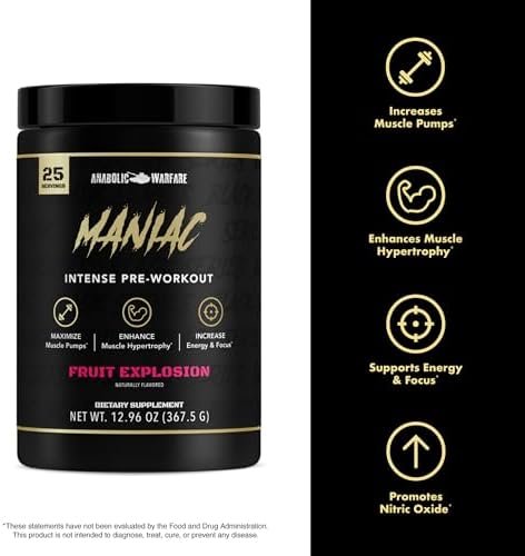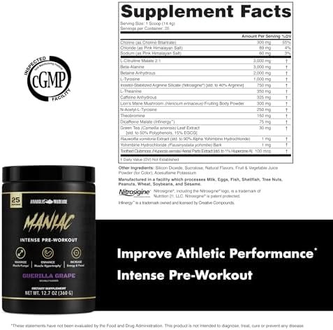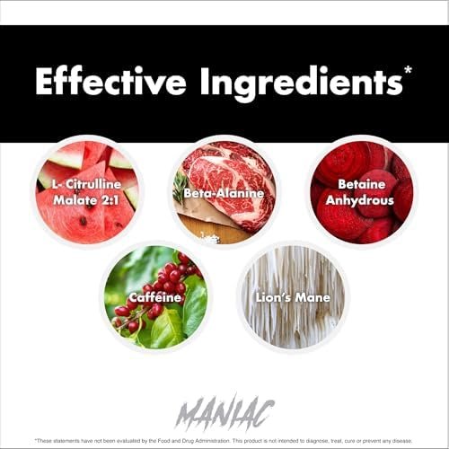 Massive Pumps*- You may need to buy a few new shirts after taking this pre-workout. Maniac is loaded with 3G of L-Citrulline Malate 2:1 which supports nitric oxide production and supports massive muscle pumps. Maximize your muscle pumps with Maniac!*
