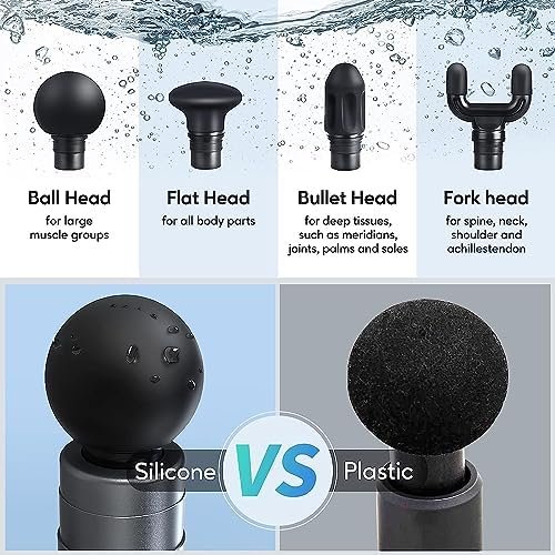 【4 Silicone Heads Fit the Whole Body】Interchangeable heads in 4 shapes to target specific muscle groups for faster recovery. Can be widely used on the shoulder and neck, back, legs, soles, and other parts. Silicone skin-friendly massage head is more dirt-resistant than ordinary foam materials, waterproof and easy to clean. Don’t worry about sweating or getting dirty.