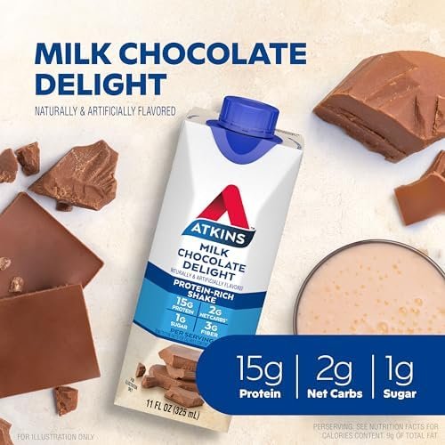 Atkins Milk Chocolate Delight Protein Shake, 15g Protein, Low Glycemic, 2g Net Carb, 1g Sugar, Keto Friendly, 12 Count