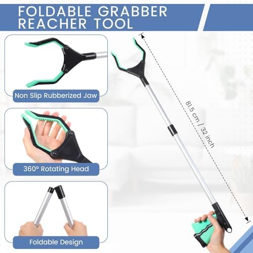 360° Rotatable Foldable Grabber: our grabber reacher tool is foldable with non slip jaw design, allowing you to pick up small items easily, such as coins, keys, etc., not easy to fall off; With 32 inch extended handle and 360° rotatable claw, it can be applied both vertically and horizontally, so you do not need to stoop down for hard to reach places