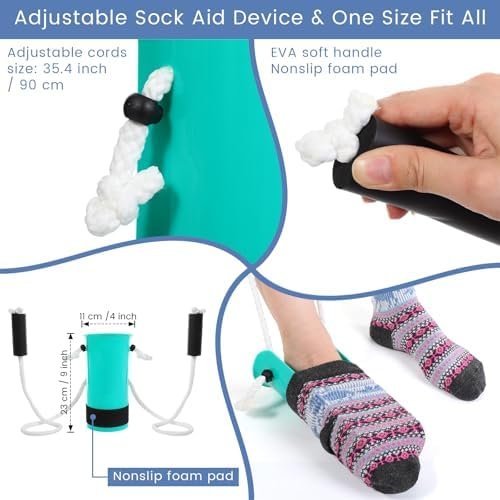 Adjustable Cords, One Size Fit Most: the device for putting on socks is approx. 4 inch wide and 9 inch long, with 35.4 inch long adjustable cords, allowing you to adjust the length you need with the elastic button; And it fit most types of socks, including athletic socks, dress socks, stockings, casual socks and so on