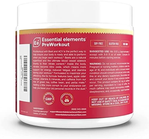 Essential Elements PreWorkout Powder with Beet Root & ACV | Superfood Energy Supplement & All-Natural Nitric Oxide Booster Plus Caffeine 30 Servings