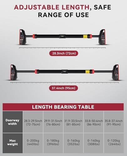 【Adjustable Width & Comfortable Grip】Featuring an adjustable width from 72cm to 95cm (28.3in-37.4in), this Pull-up Bar for Doorway accommodates various door frames while ensuring a snug fit. The high-quality EVA foam handles provide superior comfort and grip, allowing you to focus on your workout without discomfort or slipping.