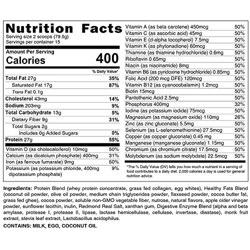 Keto-friendly, science-backed blend of protein, healthy fats, apple cider vinegar, probiotics, fiber, vitamins and minerals without any added sugar, extra carbs or anything artificial.