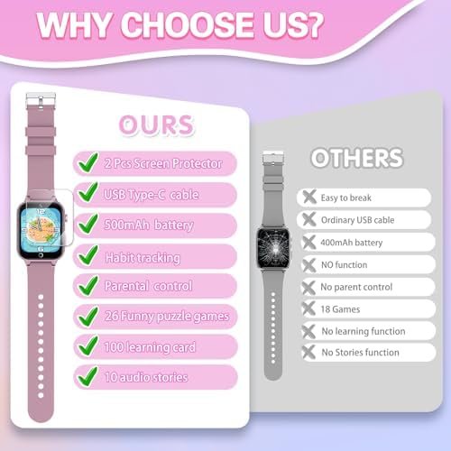 【Upgrade Kids Watch】As the newest upgrade kids smart watch with 2 HD Screen Protector, introduces the newest habit tracking function, stories, and learn card that traditional watches don’t have, cultivating children’s good habits and imagination. And with playable 26 games to choose from kids. These are suitable for children of multiple ages. That can effectively exercise kids brain and logical thinking ability. It is a perfect gift for 4-12 year old boys and girls