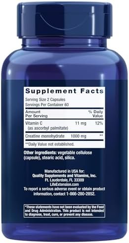 Life Extension Creatine Capsules – Creatine Monohydrate – Promotes Strength, Lean Muscle, Healthy Endurance – Non-GMO, Gluten-Free – 120 Capsules
