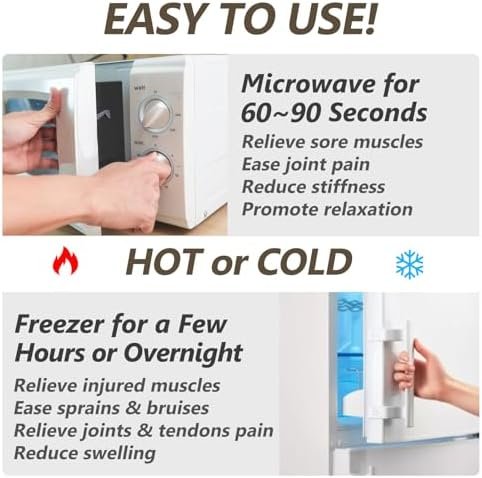 Hot & Cold Compress: Heat the rice heating pad in the microwave for 60~90 sec! You will enjoy up to 20 min soothing and deep moist heat. Freeze the microwave heating pad for neck and shoulders to get a pleasant coldness to reduce swelling due to strains and sprains. (DO NOT OVERHEAT).