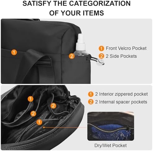 WET & DRY SEPARATION DESIGN: Multi-pocket design, the separate waterproof zipper pocket in the main compartment of the mini gym bag is made of high-density waterproof PU material, which is used to separate wet items such as toiletries, towels or swimsuits, goggles and other wet items from your dry clothes, which prevents your clean clothes from getting dirty or wet.