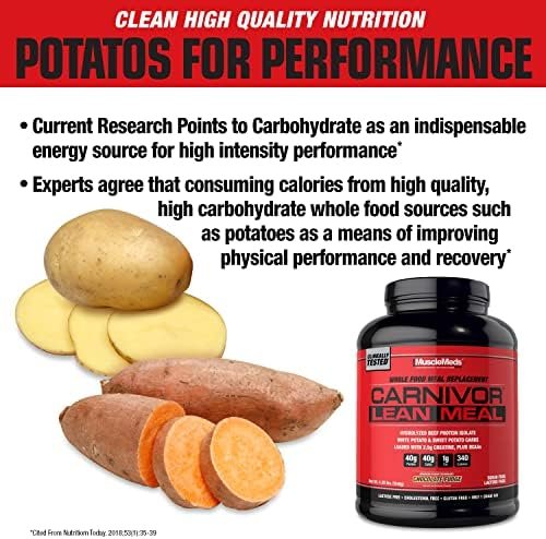 MuscleMeds CARNIVOR LEAN MEAL whole food meal replacement shake, MRE, beef protein isolate, white potato, sweet potato, 40g protein, 40 g carbs, lactose free, sugar free, Chocolate Fudge 20 servings