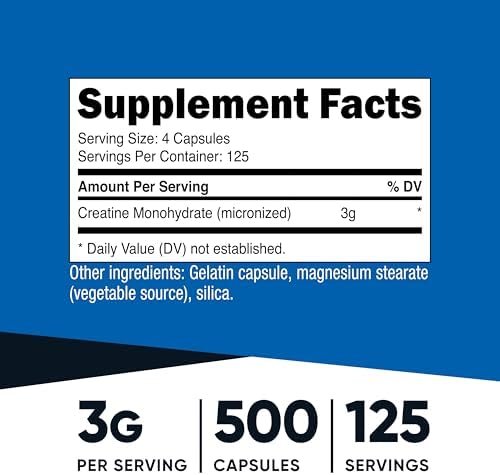 500 Capsules (125 Servings) of Creatine Monohydrate Per Bottle