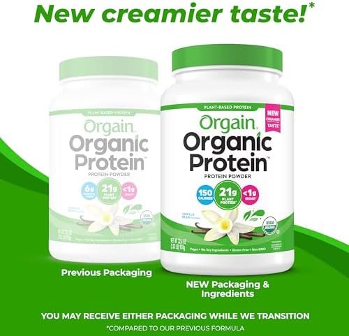 Orgain Organic Vegan Protein Powder, Vanilla Bean – 21g Plant Protein, 6g Prebiotic Fiber, No Lactose Ingredients, No Added Sugar, Non-GMO, For Shakes & Smoothies, 2.03 lb (Packaging May Vary)
