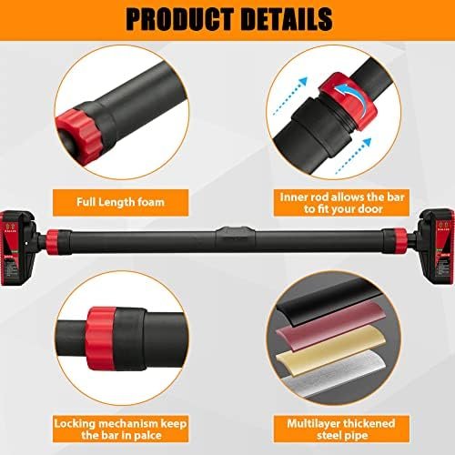 đȘăADJUSTABLE PULL UP BARSăDoor frame pull up bar adjustable length for easy fitting in most of door frame between 27.6″- 36.2″(70cm-92cm). It can be installed in any gement walls, security doors, solid wood doors, corridors but not including fragile door frames, glass doorframe, hollowed doorframe, ceramic tile wall, Fragile Wall. Suitable for standard doorway, perfect for home, garage or office use.
