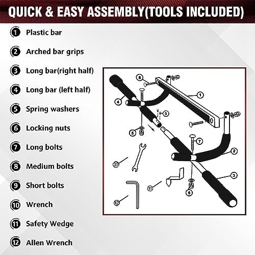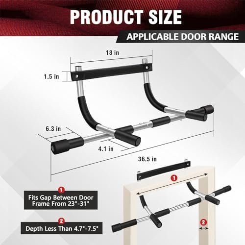 EASY TO INSTALL – The pull up bar for doorway comes with an assembly manual and tool, allowing for easy installation and removal. With a length of 36″, it fits standard doorways ranging from 23″ to 31″ wide and 4.7″ to 7.5″ deep. It uses a lever to attach securely, requiring no drilling and ensuring your door remains undamaged.