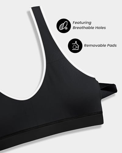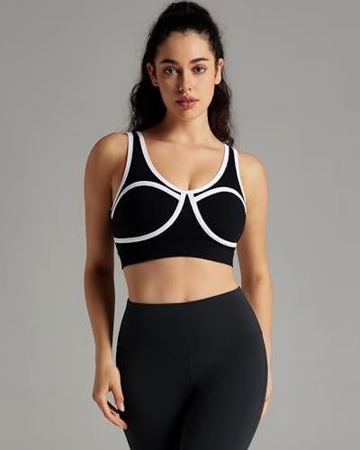 QUEENIEKE Piping Trim Sports Bras for Women – Padded Slim Fit Medium Impact Workout Crop Tank Top Scoop Neck Yoga Bra