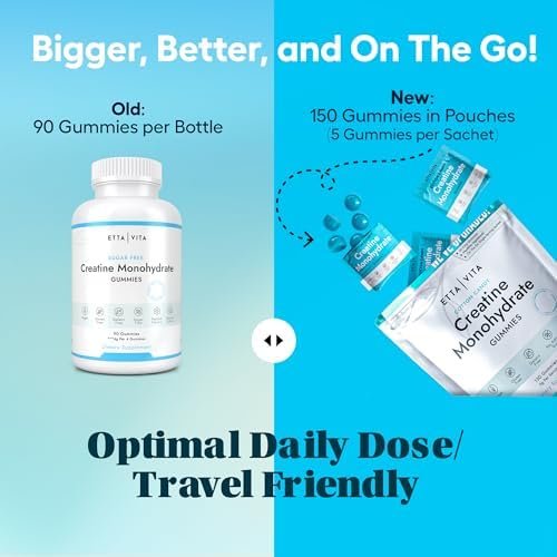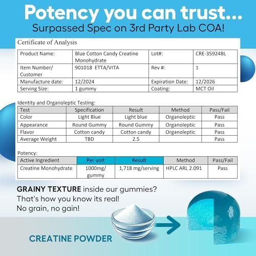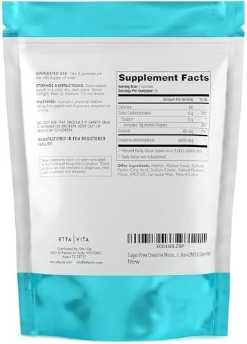 Potent Formula & Improved Bioavailability – Etta Vita’s unique formula of Creatine Monohydrate is effective, with 1g of Creatine per gummy. The gummies are coated in an MCT Oil, which improves bioavailability and absorption in the body. Creatine helps reduce post-workout muscle fatigue, improve athletic performance, and increase muscle development and growth.