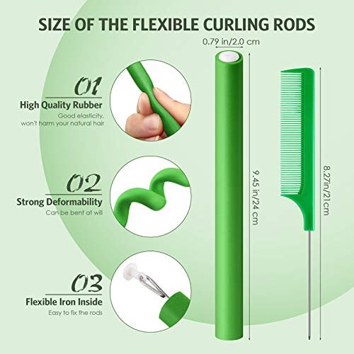 Syhood 30 Pcs Flexible Curling Rods 9.45 Twist Foam Rollers Soft Foam No Heat Hair Rods Rollers and 1 Steel Pintail Comb Rat Tail Comb for Women Long Short Hair(Green,9.45 x 0.79 Inch)