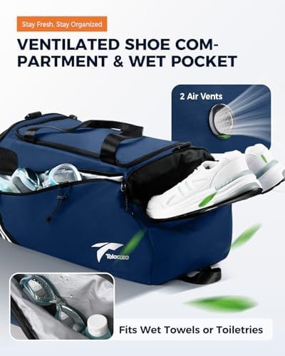 WITH SHOE COMPARTMENT: Our Tolaccea travel duffel bag provides you with a shoe separation, so that you can separate your shoes from clean clothes or other items after exercising or hiking, which is enough to store a pair of size13 sneakers or high heels. We have also designed 2 metal ventilation holes to help keep the internal air dry and fresh.