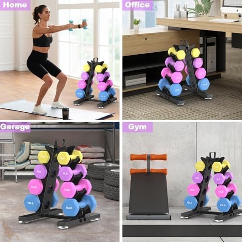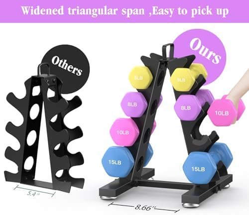 [Stable A-Frame Design]: Made of heavy-gauge steel for home gym weight rack for dumbbell , sturdy and durable, stable triangular structure design for stability and small footprint, suitable for home gym, corner of the room, garage, office. Assembled size 11.8 “L x 12.5 “W x 19.3 “H, gross weight 6.5 lbs.It is a great fitness equipment storage option for those of you who work out on a daily basis