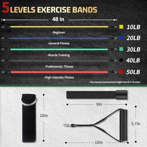 Adjustable Resistance Bands – Maximum equivalent of 150 lbs, come as a set of 5, 48-inch long colored exercise bands: Yellow(10 lbs), Blue(20 lbs), Green(30 lbs), Black(40 lbs), Red(50 lbs). You can use the bands independently or in any combination with a maximum resistance level of 150 lbs